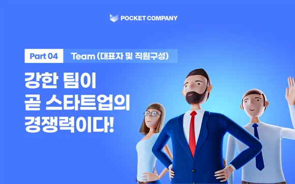 Team은 이 사업을 실행할 대표자와 팀원들의 맨 파워를 보게 되는데요, 일반적으로 처음 창업을 하는 경우엔 기획 / 디자이너(마케터) / 기술자 이렇게 세명의 팀원이 이상적이에요.